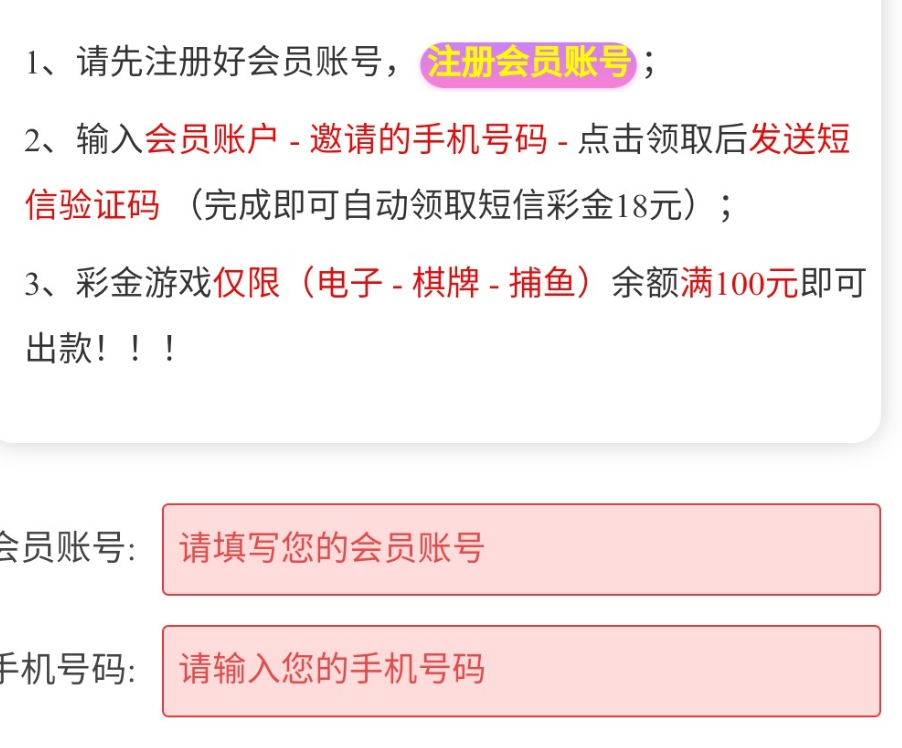 活动详情:进网站随便输入一个账号 再输入自己手机号 是特邀的话再去注册 特邀碰瓷都去试试 还有下载app彩金 游戏和提款限制自行查看