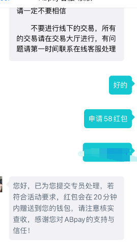 这个跟前面老哥发的名发是差不多的 但撸过了名发这个也可以撸 !!!这个是内置钱包 两个平台不影响  ab也不查ip 注册好绑卡去提交abpay充值任意金额  然后跳转abpay 完善信息后下载完成2级认证绑定收款方式   找abpay客服申请58红包 亲测10分钟到然后返回平台充值58后先绑定速发银行卡和abpay的收款账号 还要完成2级认证!!! 然后下载abpay登录进去 才能申请58,ab和速发账号绑定的信息必须一致 一步没到位都申请不了! 找微聊上级的导师 M219203405