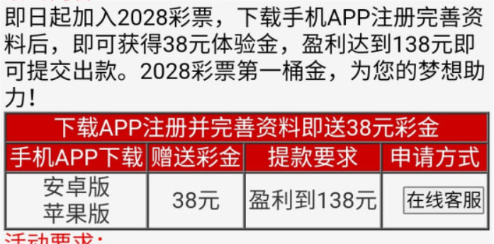 活动详情:注册账号绑定信息,特别是手机号,联系在线客服说特邀彩金送38,如果没送可以注册等2天以后再碰,基本都会给,自行碰瓷,出款自测!